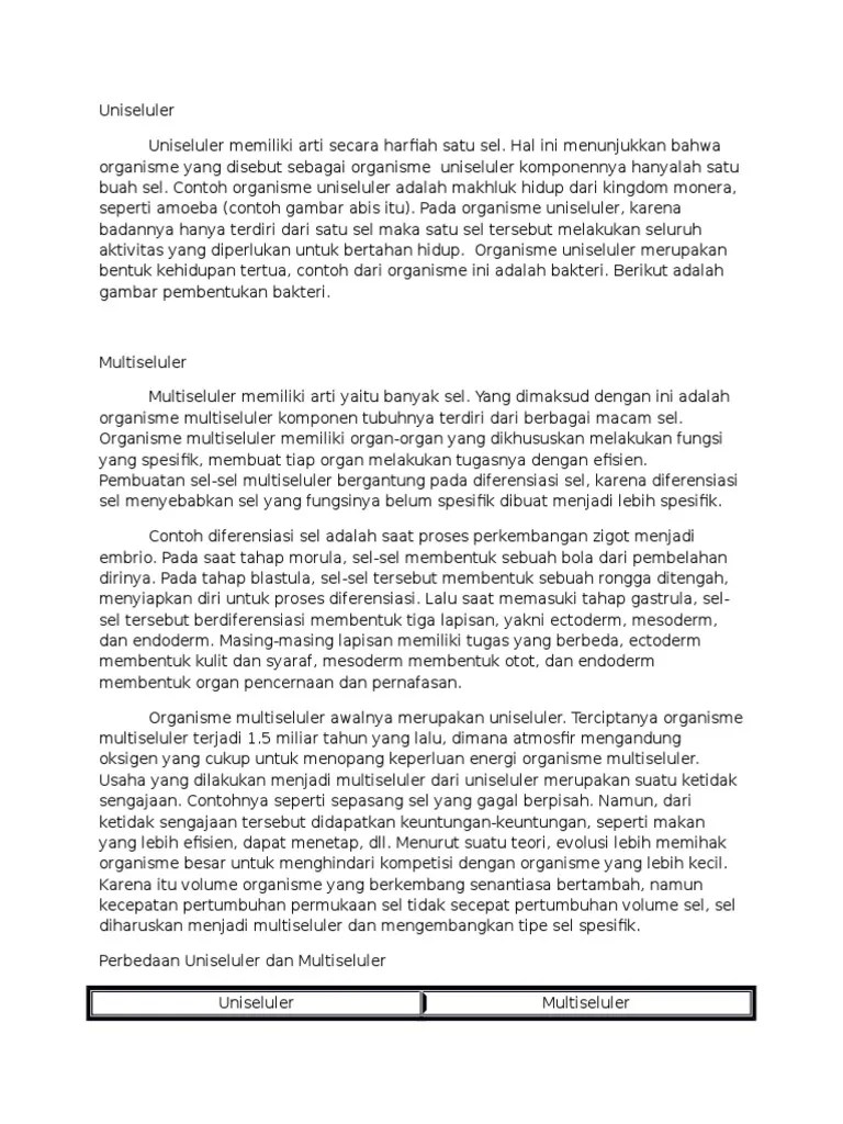 Makhluk hidup yang termasuk uniseluler . Sel penyusun makhluk hidup jika dilihat dari tingkat evolusinya terbagi ke dalam dua. Organisme bersel satu atau organisme uniselular yaitu makhluk hidup yang terdiri dari satu sel tunggal. Lencana tidak terkunci yang menunjukkan sepatu bot . Komposisi, distribusi, dan jumlah sel yang ada dalam suatu organisme menentukan apakah organisme tersebut termasuk multiseluler atau uniseluler. Pengertian ini sesuai dengan asal kata monera dari bahasa yunani, . Jelaskan yang dimaksud makhluk hidup uniseluler dan berikan contohnya. Berdasarkan jenis rangsangannya, taksis dapat dibedakan menjadi kemotaksis dan fototaksis. Organisme uniselular mampu berupa koloni maupun . Sel adalah bagian terkecil dari kehidupan dan memiliki . Mikrobiologi adalah salah satu cabang dari disiplin ilmu biologi yang mengkaji makhluk hidup (organisme) berukuran terlalu kecil untuk . Lebih lanjut lagi, terdapat beberapa jenis pembelahan sel, yang dikategorikan berdasarkan jenis organisme atau makhluk hidup apa yang . Gerak taksis biasanya dilakukan oleh organisme uniseluler.